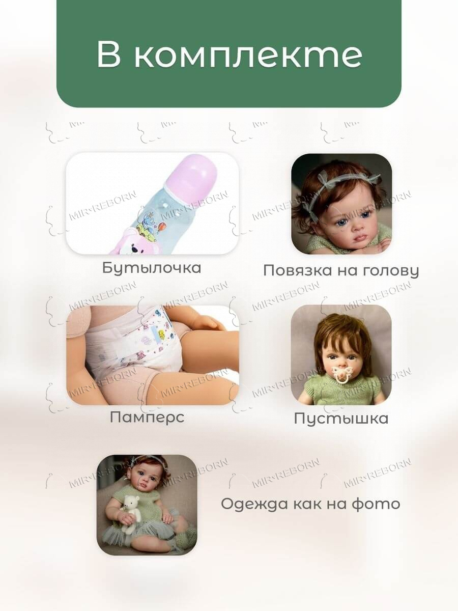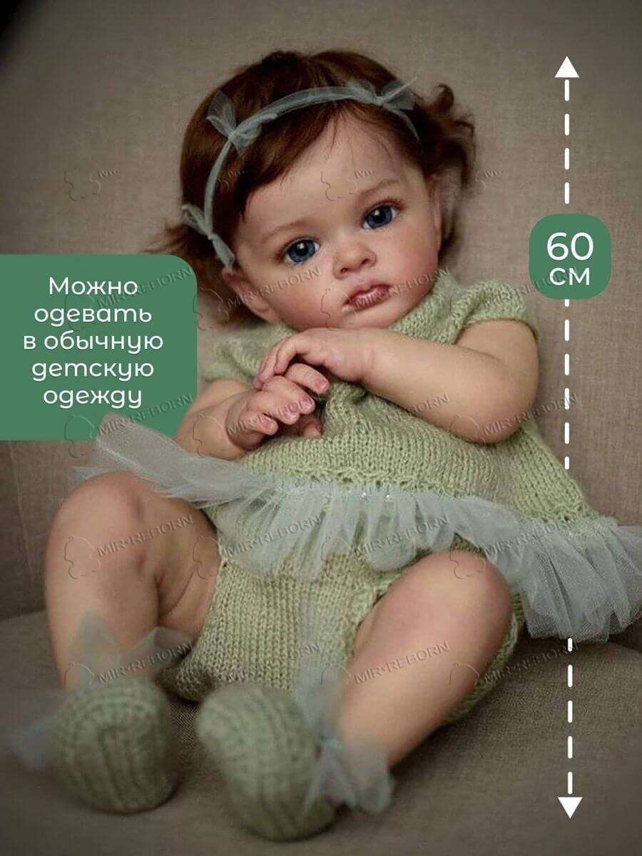 Мягконабивная кукла Реборн девочка Алиса, 60 см – реалистичная игрушка в виде настоящего ребенка. Силиконовая кукла Реборн Алиса имеет такие же размеры, как настоящий ребенок, поэтому ее можно наряжать в одежду для малышей. Кукла reborn раскрашена вручную качественными и стойкими акриловыми красками – прорисованы глаза, губы, брови, складочки на теле. Ноготки у reborn куклы также тщательно проработаны и выглядят как у настоящего младенца. Ручное окрашивание придает игрушке реалистичный и уникальный вид. Краска не смоется, даже если мягконабивная кукла попала в воду. Кукла Реборн мягконабивная имеет волосы, приближенные к натуральным, поэтому с ними можно делать прически, укладывать или расчесывать. Ваш ребенок может создавать стильные прически на кукле Reborn с использованием собственных средств – расчесок, щеток, заколок и резинок. Мыть волосы можно. Кукла Реборн девочка не подходит для купания, но ее можно брать с собой на прогулки, в поездки или в садик. Поставляется с комплектом одежды и аксессуаров, а также свидетельством, в которое можно вписать имя куклы для девочек. Одежда, в которую наряжена кукла Алиса, выполнена из натуральных гипоаллергенных материалов, не боится стирки в щадящем режиме.